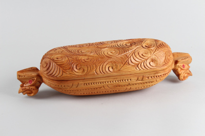 A traditional Wakahuia made from macrocarpa and carved. 440mm long.