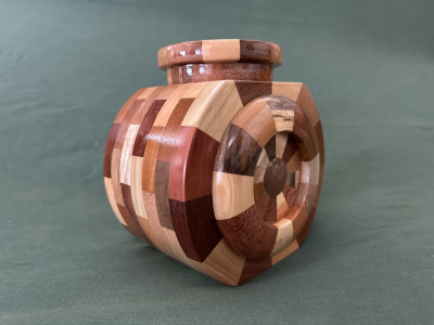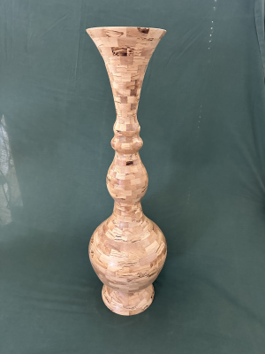 Vase for dried flowers made from 20 mixed woods, 180mm high, 175mm wide, 130mm depth. Finished in gloss enamel