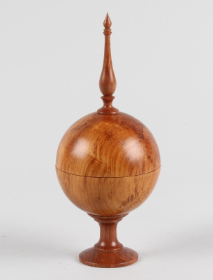 NZ Rimu 70mm sphere box. Total height 165mm. Finial and base in Pohutukawa. Finished with Danish oil.