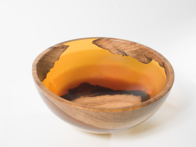 Maire root stock and resin bowl 265 Dia 125 H finished 30% gloss laquer. Maire root stock which split in half has been separated and infilled with resin coloured earthy brown dark to light bottom to top