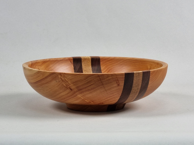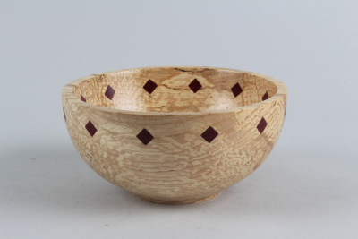 An ash bowl with diamond shaped purple heart inlays around the side. 150mm wide by 75mm high and finished in lacquer.