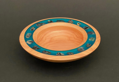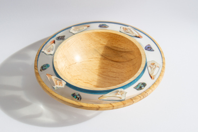 Bowl with Paua shell inlayed in resin. Finished with Carnauba wax. Diameter: 190mm, height 45mm.