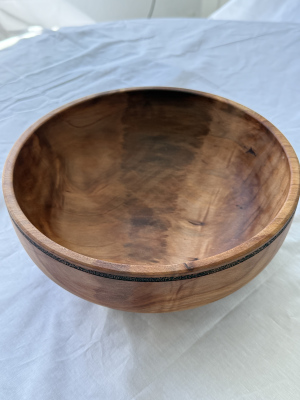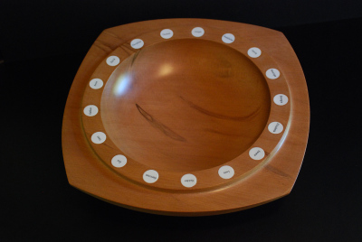 Golden Wedding Anniversary Bowl for musician friends. Kauri with the names of the couple, children and grandchildren engraved on piano key material set into the rim. Size 260 x 100mm.