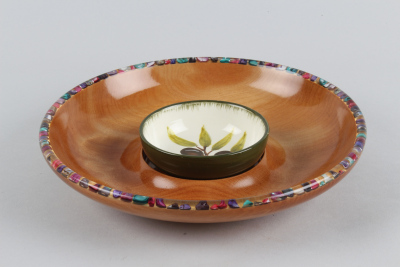 Wooden items which have been made from one or many pieces of wood into a bowl or platter shape which has been carved, decorated, coloured, textured, embellished or otherwise enhanced and remains functional.