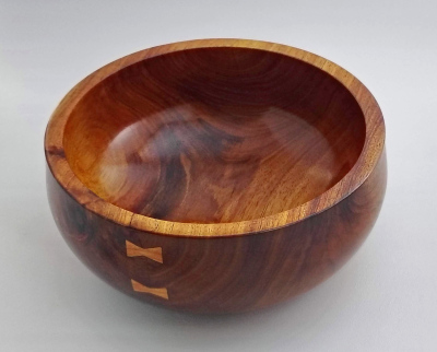 This piece is a laminated bowl made from Macrocarpa, Oak and Kwila. Finished with 3 coats of danish oil. D=50mm H=65mm. Made as a wedding gift, this bowl commemorates two lives blending into one.