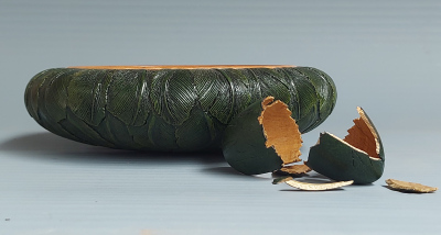 Te Kea Kohanga Kore- translates The Kea's Empty Nest. Kauri, turned, carved, dry brushed with acrylic colour and finished with semi gloss clear. 195mm wide x 57mm high