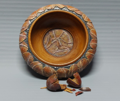 A decorative bowl with a multi layered 'petal' rim, painted and decorated with pyrography, acrylic paint and mica pigment powder on Jacaranda timber. Finished with acrylic lacquer. Dimensions 190mm x 60mm