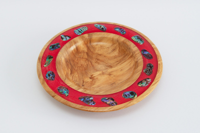 Wood Rimu Burl. Resin Inlay with Paua Shell and Red Metallic Paint. 185cm across X 2cm deep. Finished with Sanding Sealer, EEE wax and Old Bucks wax.