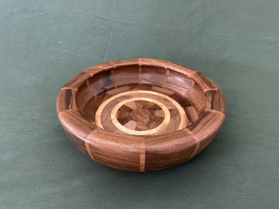 Segmented bowl made from Black Walnut & Pine, 60 small segments and 12 large segments,.265mm wide, 70mm high. Finished with Danish Oil (Briwax)