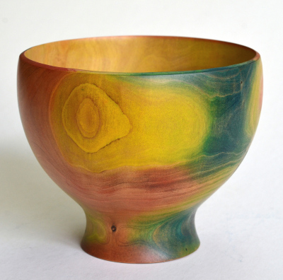 A rough old case-hardened Red Beech burr given a second chance with the addition of an epoxy resin rim. Reminiscent of sunset at the beach. 150 Dia. X 100 H. Epoxy, colours, iridescent powders. Mirotone pure Danish oil.