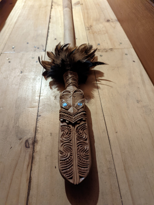 Manuka taiaha with pāua eyes and awe dressing made of muka (harakeke fibres) and chicken feathers. A useful domestic item for protection and combat. A taiaha is a traditional and lethal Māori weapon for close combat. The first taiaha was bestowed by his brothers in the heat of battle to Tūmatauenga-- god of war, hunting and fishing.