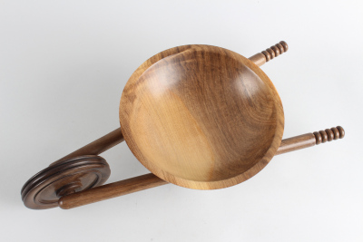 A Fruit Bowl on a novel Wheelbarrow stand, with rotating wheel. The bowl is unattached for convenience, while still able to sit securely on the framework. Wood is NZ Puriri, with a functional wax finish. Size: L390mm x W185mm x H100mm.