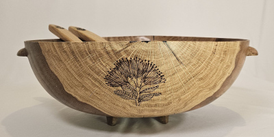 This English Oak bowl on legs with handles. 400mm wide x 155mm high x 3mm thick, Handles 145mm long x 20 wide x 15mm high. English Oak Spoon 380mm log x 75mm wide, English Oak Spatula 380mm long x 80mm wide. Finish Spray lacquer.