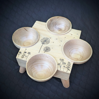 Four emerging bowls for children's sweet treats. The European beech block is turned on multi axis centres and supported on tapered legs. Laser engraved flying dandelion seeds emerging from the plants continue the emerging theme. 245mm x 245mm x 95mm